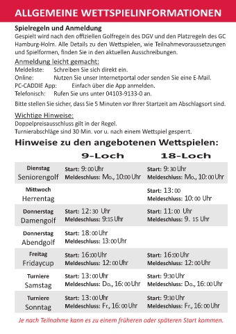 Gespielt wird nach den offiziellen Golfregeln des DGV und den Platzregeln des GC